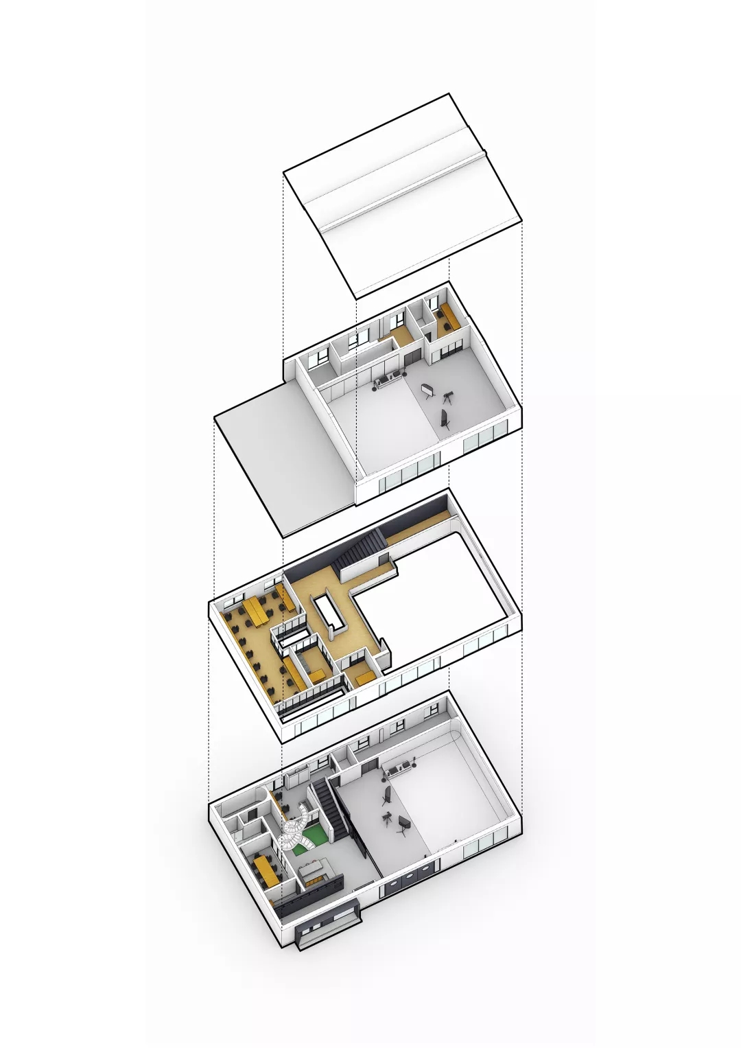 ASTUDIO攝影工作室是一個多功能的復(fù)合空間,UUA把拍攝、化妝、接待、辦公、會議、休閑等多種功能有機地融合在這個通高的廠房之中,空間緊湊又富于變化。拍攝區(qū)為最重要的功能單元,由于需要足夠的長寬高空間來滿足設(shè)置無影墻、布景布光以及拍攝距離等需求,所以設(shè)計師將一層的一半劃歸為1號拍攝區(qū),保留雙層通高的空間形式;另一半則加建出雙層空間,其中一層作為接待,二層作為辦公。廠房的三層因為原本具有足夠的層高,因此被設(shè)置為2號拍攝區(qū)。