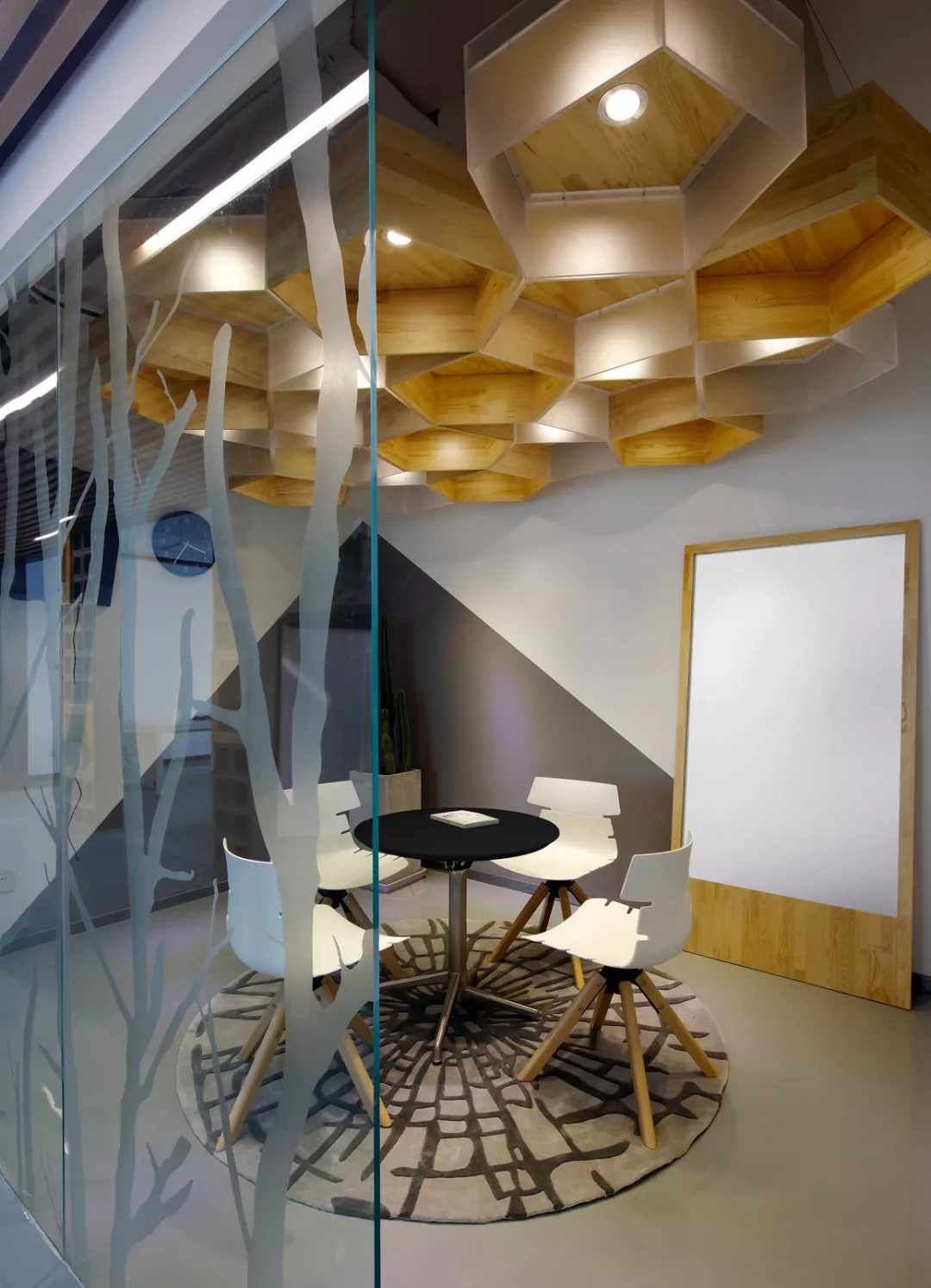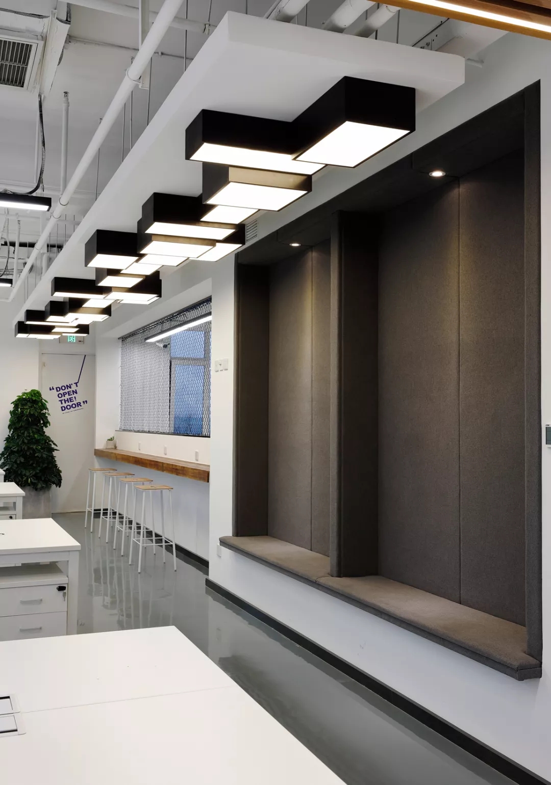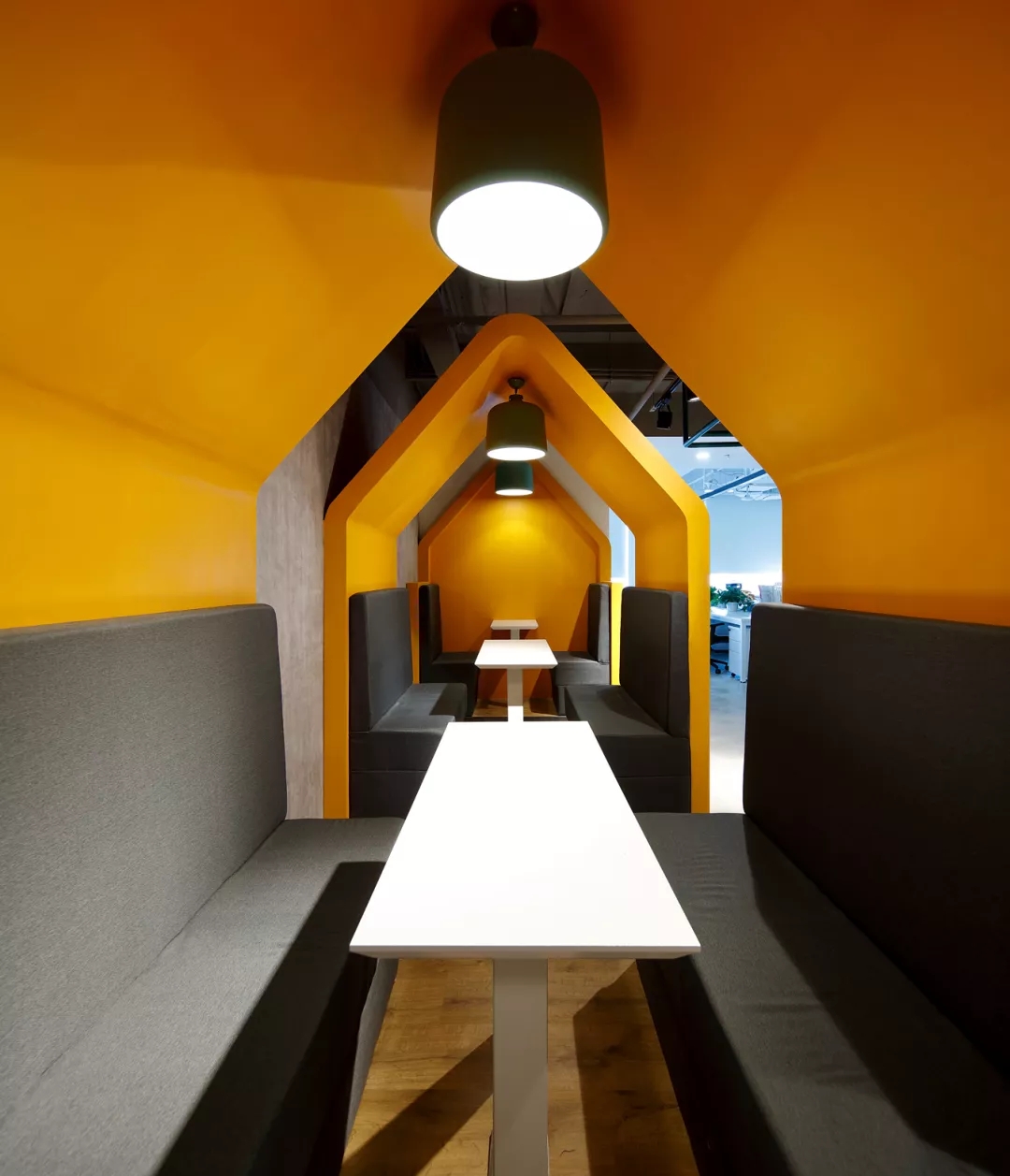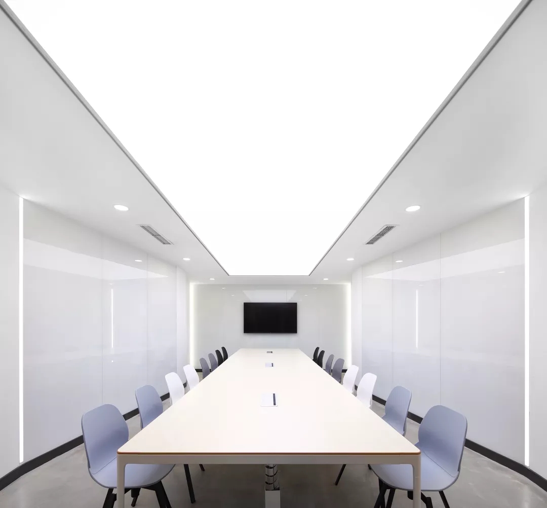 最新完成的整層辦公區(qū)延續(xù)了主體風格,少了花俏的點綴,更多地使用色彩碰撞來提振精神,比如亮橙色開放會議間與品牌VI的臟灰色搭配。也首次嘗試了全白色調的通透會議室,算是對極致風格的小探索。