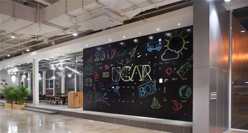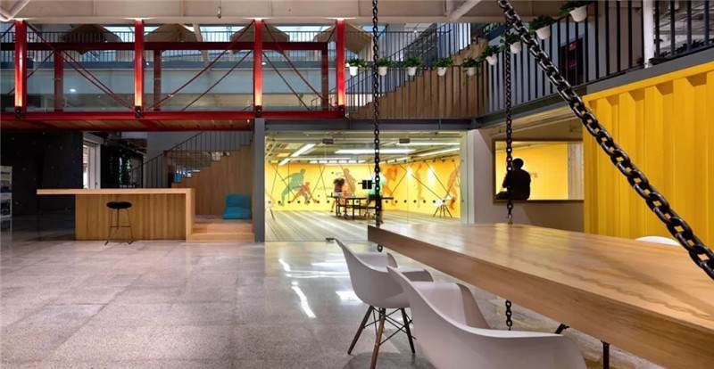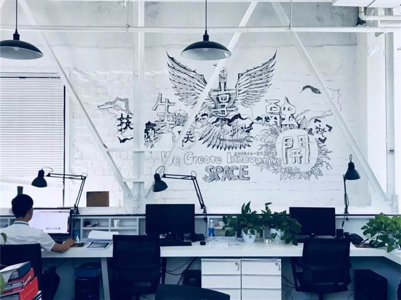 比如這張圖,也是華米科技北京的辦公室,用奧松板開兩個(gè)洞,精巧可愛的睡眠艙趴在墻上,利用兩個(gè)洞把它組成了自行車的輪廓,超萌的壁畫使墻面不再單一,色彩的對比更加直觀,同時(shí)用太空艙的形式增添趣味點(diǎn),不論是做設(shè)計(jì)師還是做工匠,都要秉持設(shè)計(jì)的理念去進(jìn)行選材和制造工藝,把握好每一個(gè)細(xì)節(jié)。