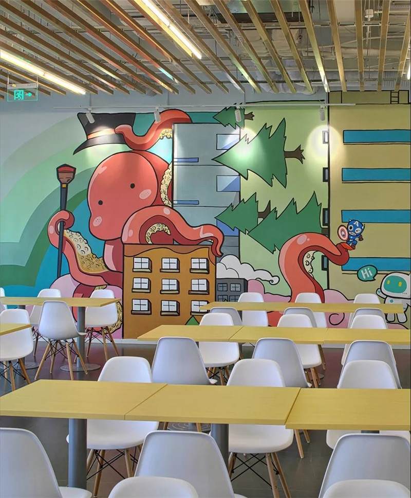 空間氛圍不同,所以圖形裝飾也會因地制宜的改變,用暖色更動(dòng)態(tài)的感覺。繪制的粉筆畫,可以定期的更換,像黑板報(bào)一樣制定不同的主題,它就是一面活的展示墻。