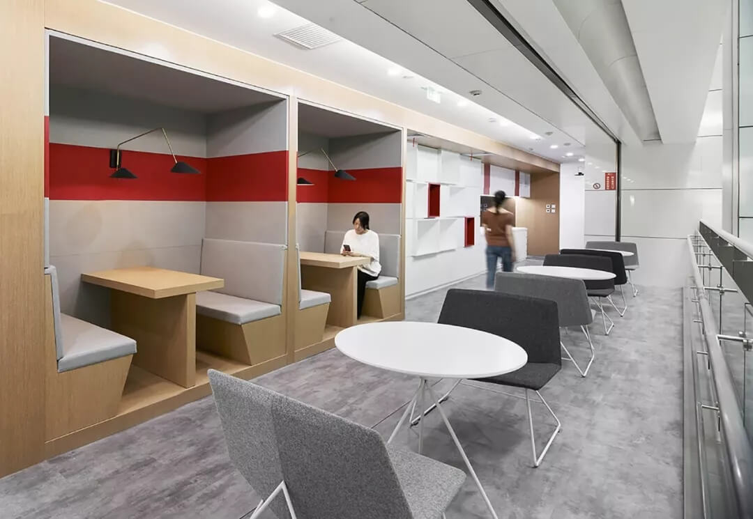 核心筒是整個(gè)辦公空間的混合功能區(qū),頻繁產(chǎn)生互動式交流,頭腦風(fēng)暴,也是重要的會客及自由移動式辦公區(qū)。在設(shè)計(jì)上,艾迪爾設(shè)置了滿足不同會客需求的休閑討論區(qū),連接著標(biāo)準(zhǔn)辦公區(qū)和公共通道,營造多層次交流氛圍,體現(xiàn)商湯科技開放包容的文化價(jià)值觀。