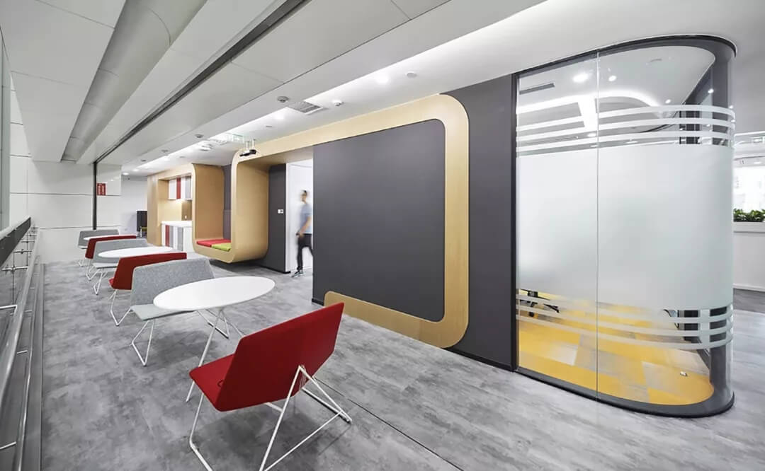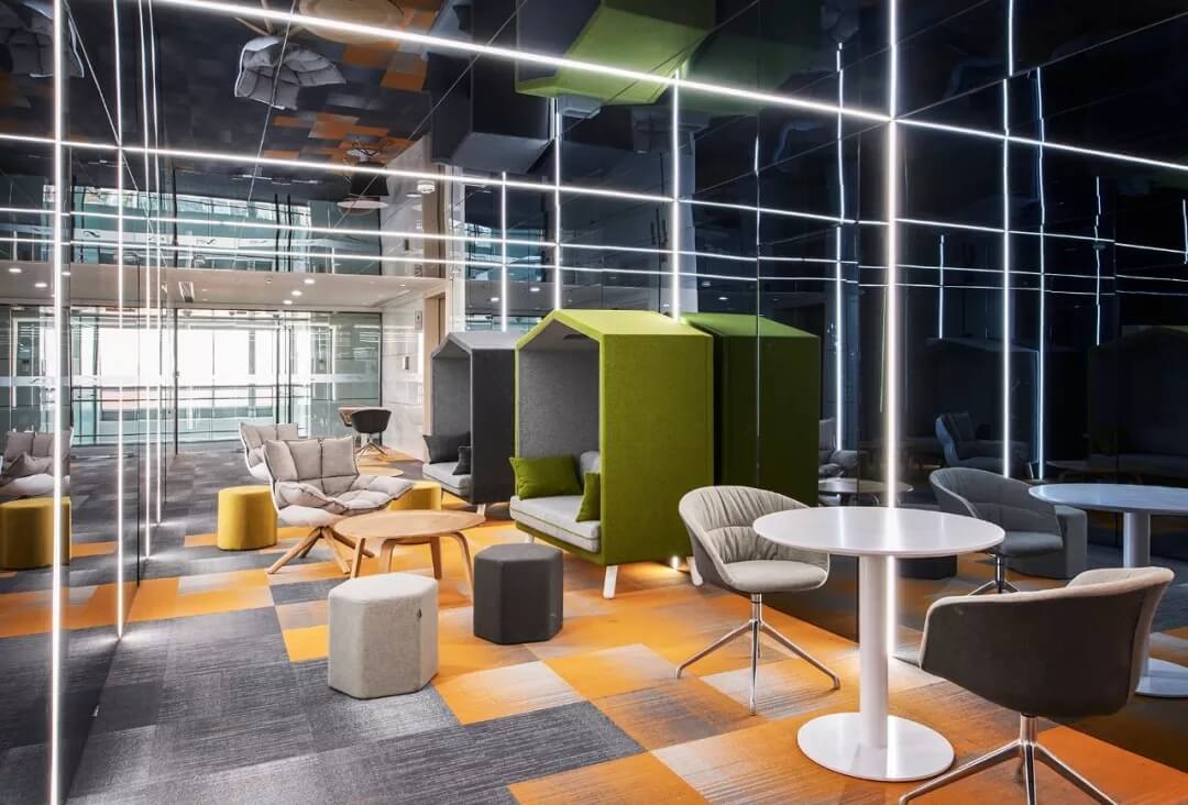在軟裝設(shè)計(jì)上,該區(qū)域家具軟裝及墻壁,選擇明快的色調(diào),展示青春活力,并且用黑色烤漆玻璃內(nèi)嵌燈帶的方式營造氛圍,透著數(shù)字化和科技感,表現(xiàn)商湯在數(shù)字時(shí)代的不同場景中,所呈現(xiàn)的多元化和創(chuàng)新性。