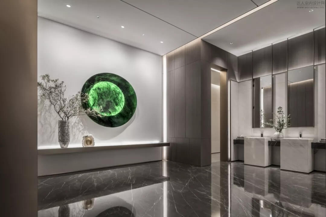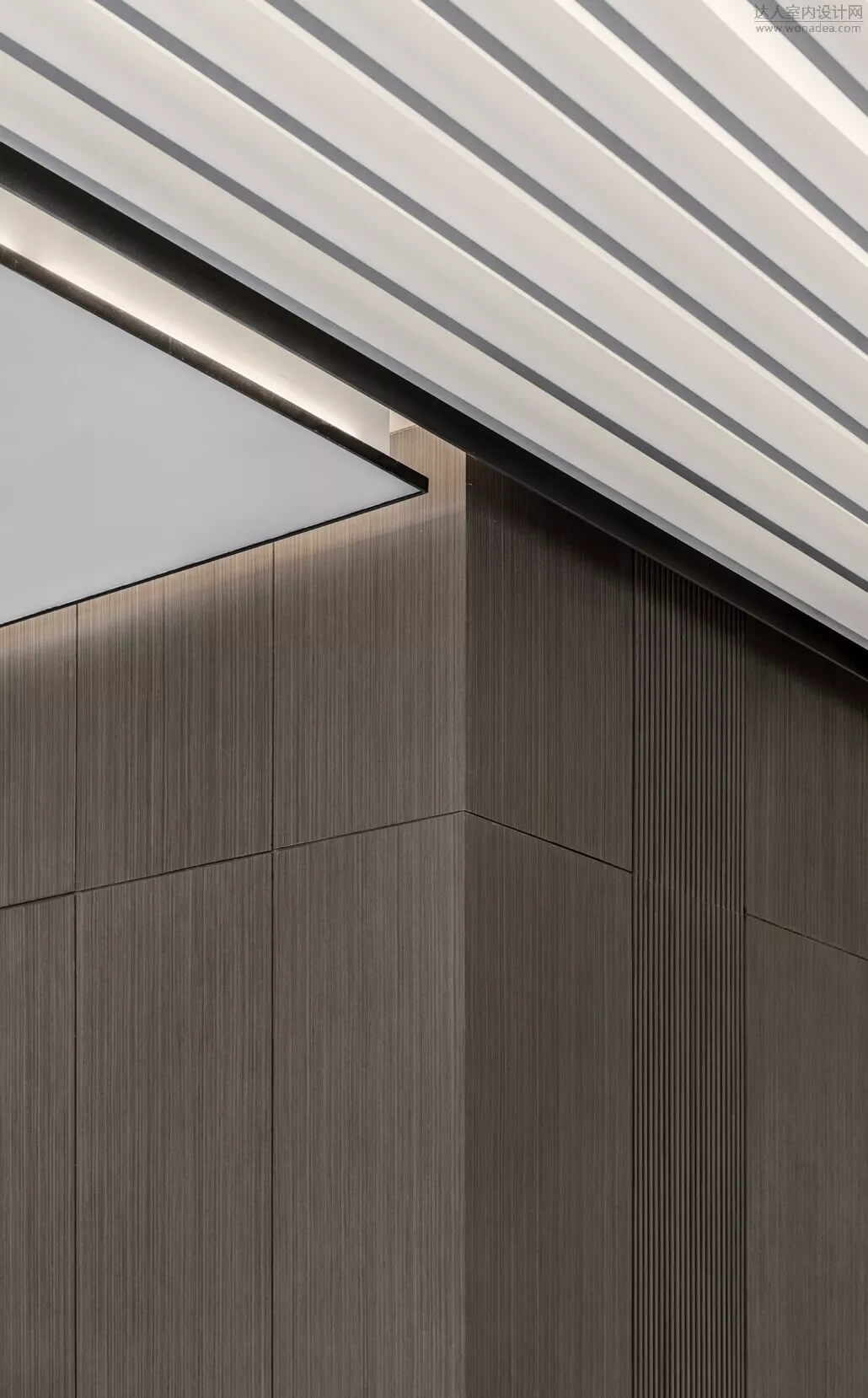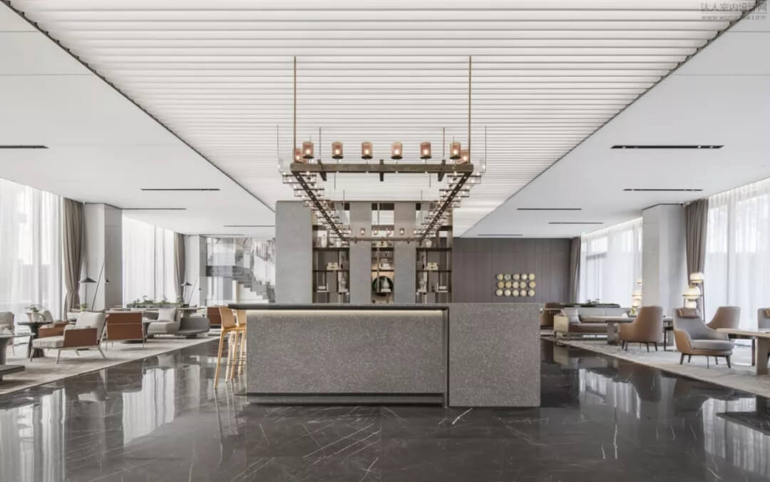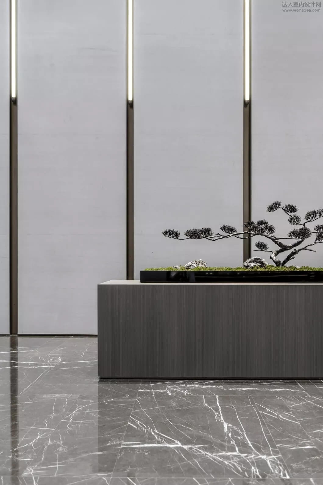 通過豐富的景觀區(qū)進(jìn)入門廳,感受到空間的空靈,立面設(shè)計(jì)過濾了來自于外界的繁復(fù)。十米挑空的大廳,墻面以米色砂巖為基底,黃銅色金屬強(qiáng)化縱向的比例,凸顯出空間的氣勢(shì)。入口對(duì)景設(shè)置的水景讓穿梭其中的訪客仿若能傾聽到潺潺水聲,同時(shí)水景和懸掛的軟裝裝置相得益彰,充滿巧妙的用意,同時(shí)也分隔了挑高通透的玻璃幕墻,虛實(shí)結(jié)合,體現(xiàn)現(xiàn)代設(shè)計(jì)的東方神韻。