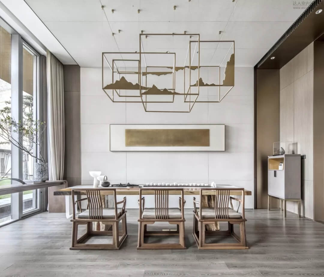 在會(huì)所品茶水吧臺(tái)區(qū)結(jié)合枯山水造景,色彩雅致內(nèi)斂,充分展現(xiàn)了中國人素來喜愛的‘靜’,同時(shí)超長條的品茶臺(tái),利用下沉庭院的景觀和室內(nèi)產(chǎn)生了互動(dòng),模糊了室內(nèi)外的界限。藝術(shù)儀式感的空間給人帶來思考的余地。