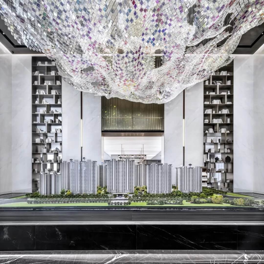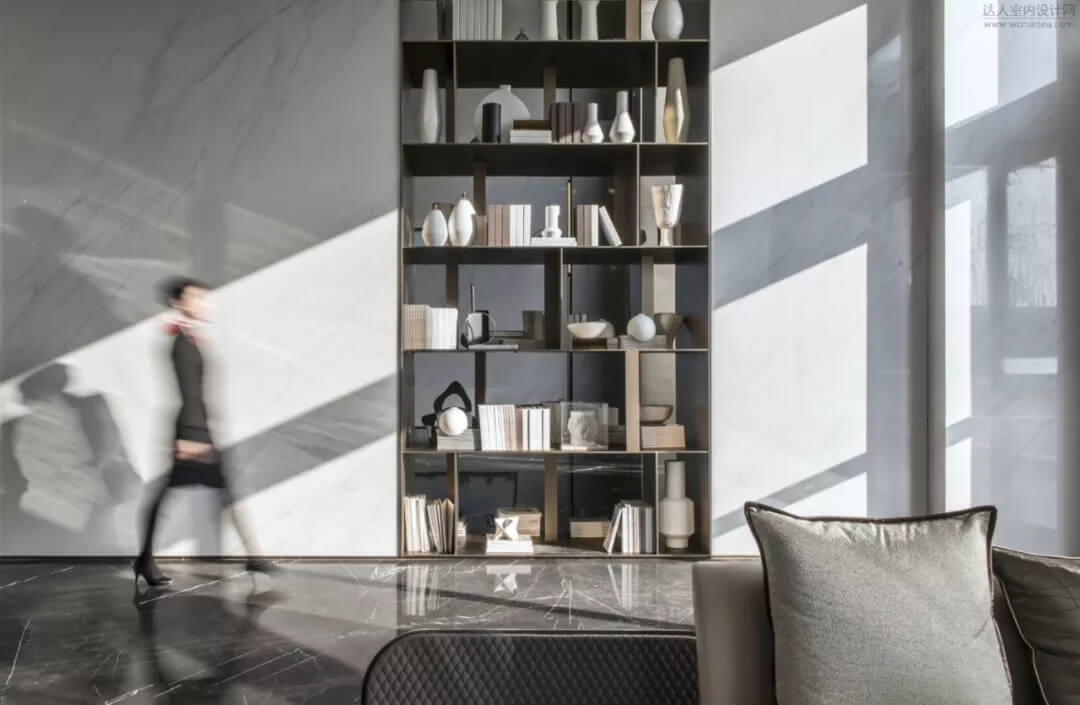 沙盤區(qū)墻面以大花白陶瓷板為主墻面,通過通高的黃銅書架體塊和金屬格柵,本身空間具有很強(qiáng)的中軸對(duì)稱的儀式感,凸顯出空間的大氣。曼妙的波浪曲線,以流動(dòng)的韻律打破空間靜態(tài),同時(shí)從明亮空靈的大堂走入半圍合的沙盤區(qū),總能給人帶來新奇感,亦是詩意與藝術(shù)的格調(diào)升華。