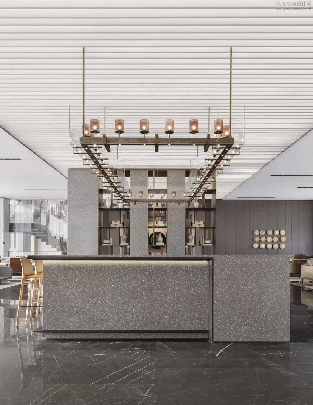 進(jìn)入洽談區(qū)大廳,通過大面積全明落地玻璃窗,最大程度地將室外的建筑、景觀效果納入室內(nèi)視野,以觀景式空間概念記錄時(shí)移景易的歲月縮影。圍合形的水磨石吧臺(tái)猶如藝術(shù)裝置,成為空間的中心焦點(diǎn)。