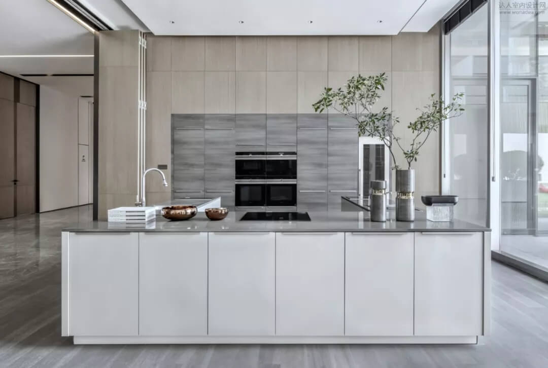 私宴,是以當(dāng)代設(shè)計(jì)來描繪文人飲酒時(shí)追求的清雅意境,寄情於山水??臻g通過折疊門和西廚吧臺(tái)區(qū)產(chǎn)生互動(dòng),空間功能既獨(dú)立又有相互滲透。延續(xù)簡(jiǎn)潔流暢的線條,布置與空間密切配合。