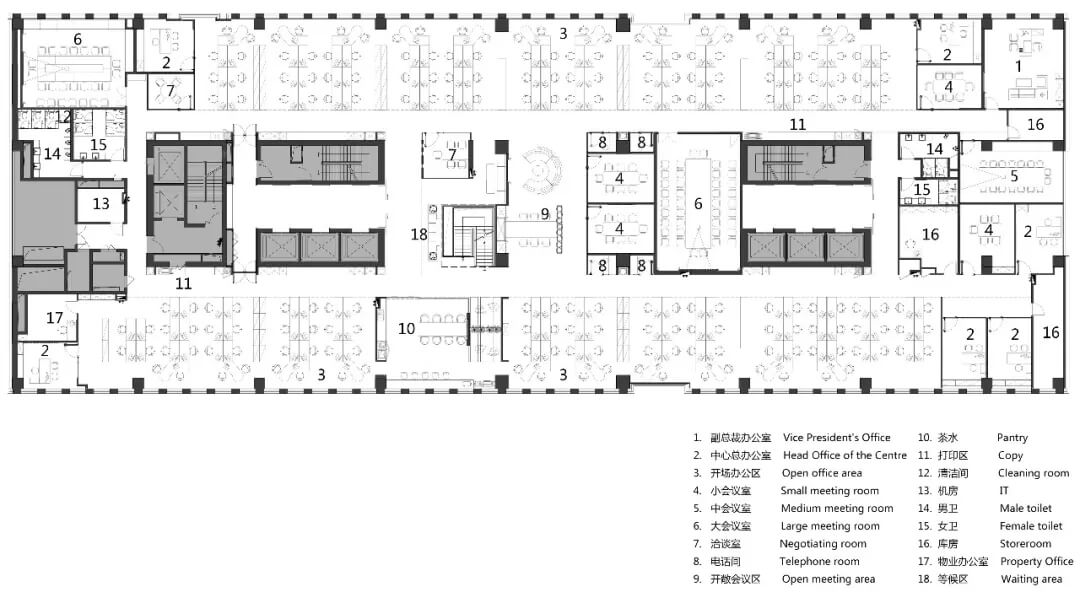 在空間規(guī)劃和功能布局上,兩側(cè)光線條件良好的區(qū)域設(shè)置開(kāi)敞辦公區(qū);核心筒區(qū)增設(shè)存儲(chǔ)空間、電話間,洽談空間,會(huì)議室,滿足各種洽談會(huì)議需求;電梯集散口設(shè)置樓梯吹拔等候區(qū)、茶水區(qū)、景觀小品等開(kāi)放共享和展示空間;采光較弱的中間區(qū)域,插入玻璃盒子做會(huì)議室。整個(gè)平面布局,在原建筑條件基礎(chǔ)上,融合融創(chuàng)需求,級(jí)級(jí)遞進(jìn),相互銜接。