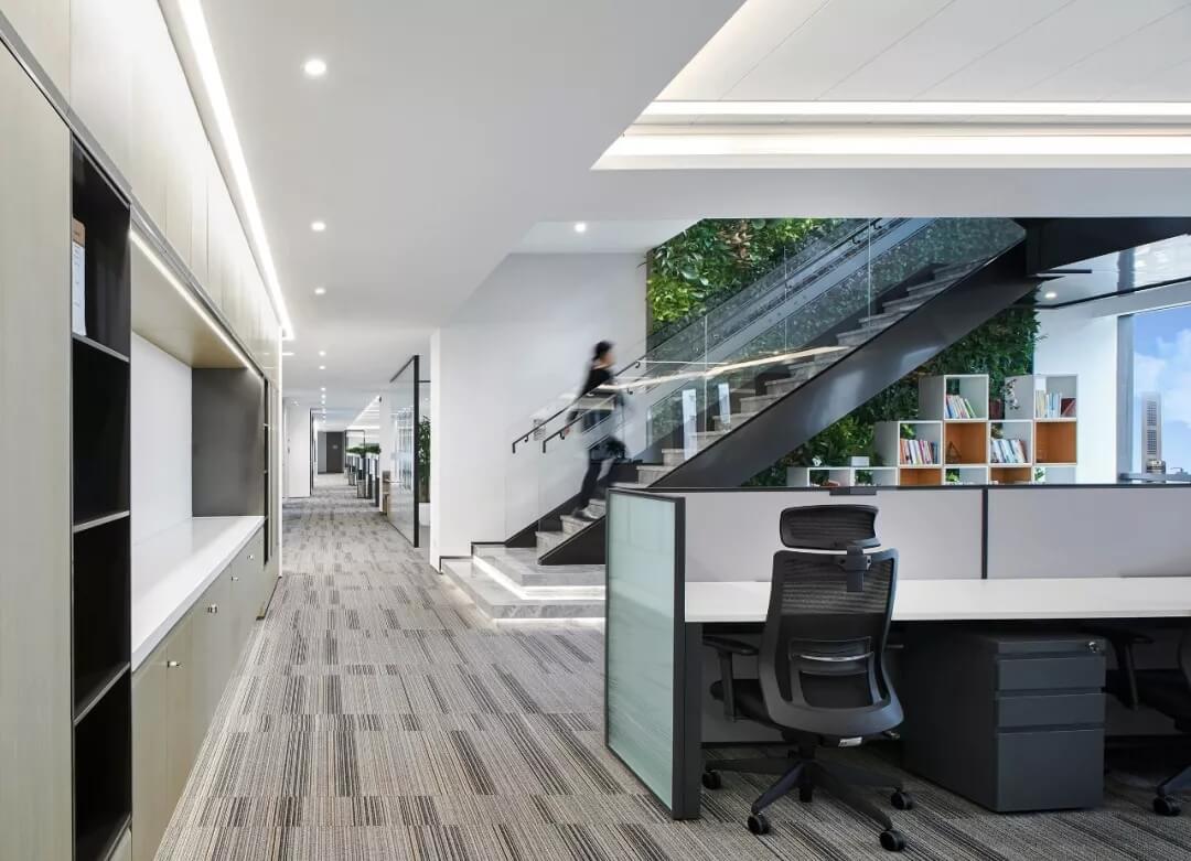 步梯采用極簡(jiǎn)折轉(zhuǎn)的造型和玻璃材質(zhì),每層的樓梯區(qū)結(jié)合景觀設(shè)計(jì),聯(lián)通電梯入口,茶水間,設(shè)置景觀小品,圖書(shū)閱讀空間,洽談卡座,等候區(qū)等,形成辦公空間的共享交流區(qū)和創(chuàng)意生活區(qū),打造有活力,展示性強(qiáng)的員工休閑活動(dòng)區(qū)。