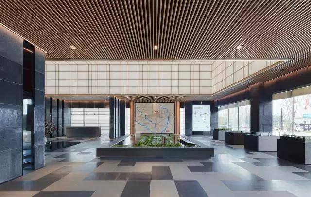 步入大廳,通過“借景”手法,將頗具詩情畫意的東方園林之景鋪呈在眼前,一抹翠綠更是讓整個(gè)空間靈動起來,巧妙而又極具視覺沖擊。在陽光照射下,投影又成為景觀的一部分,展示出自然與建筑的互動,活躍且適宜。一大排落地窗串聯(lián)起室內(nèi)外關(guān)系,正是光線的引入,讓建筑、景觀、室內(nèi)形成有序的一體。沿著預(yù)接待吧臺的動線向前穿引,便是整個(gè)銷控區(qū)域。