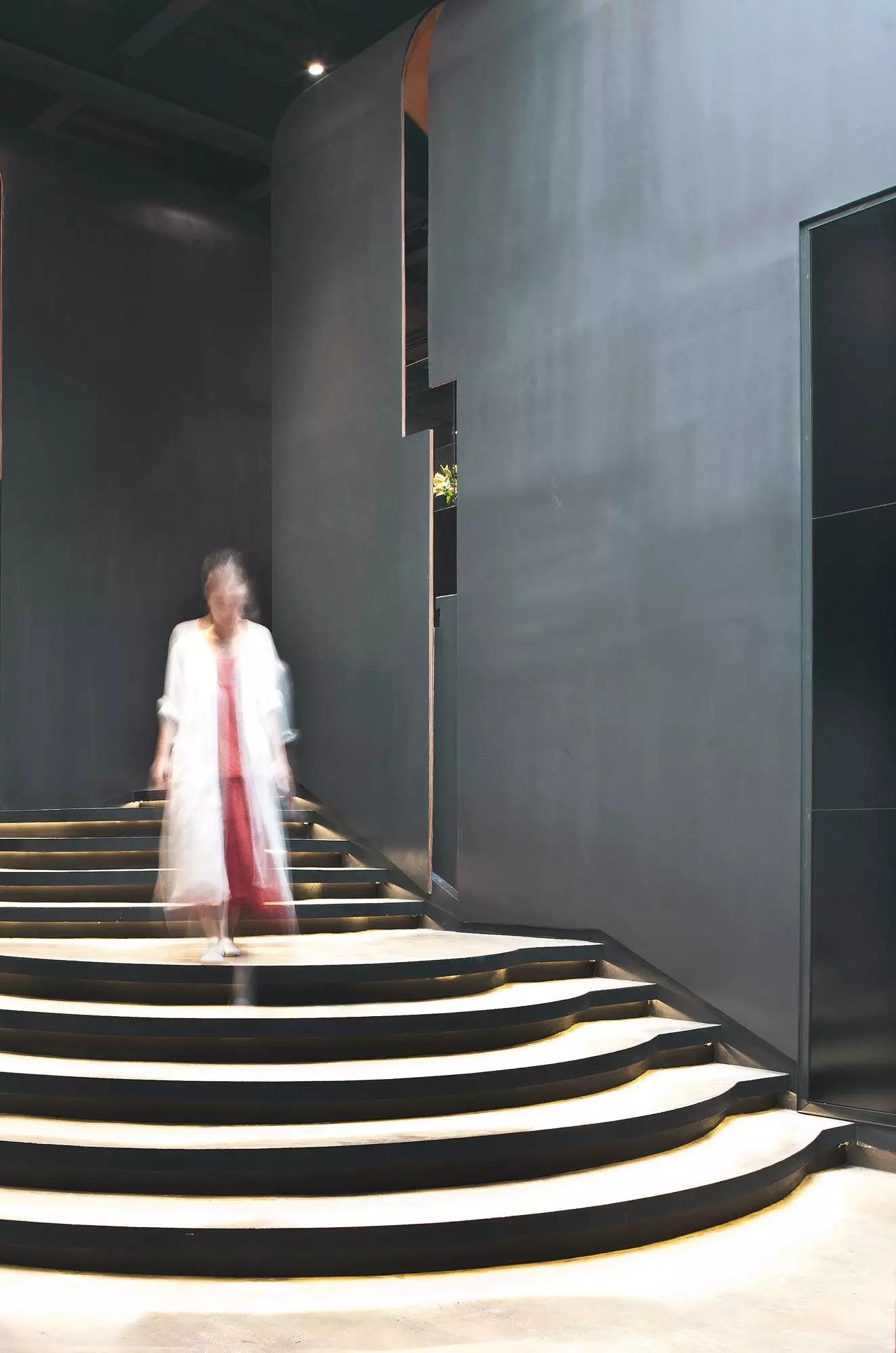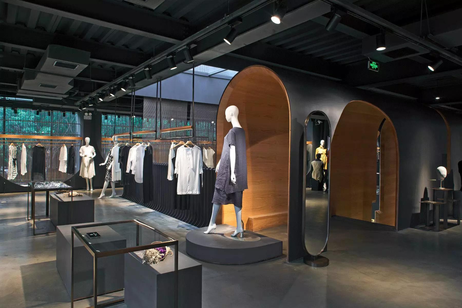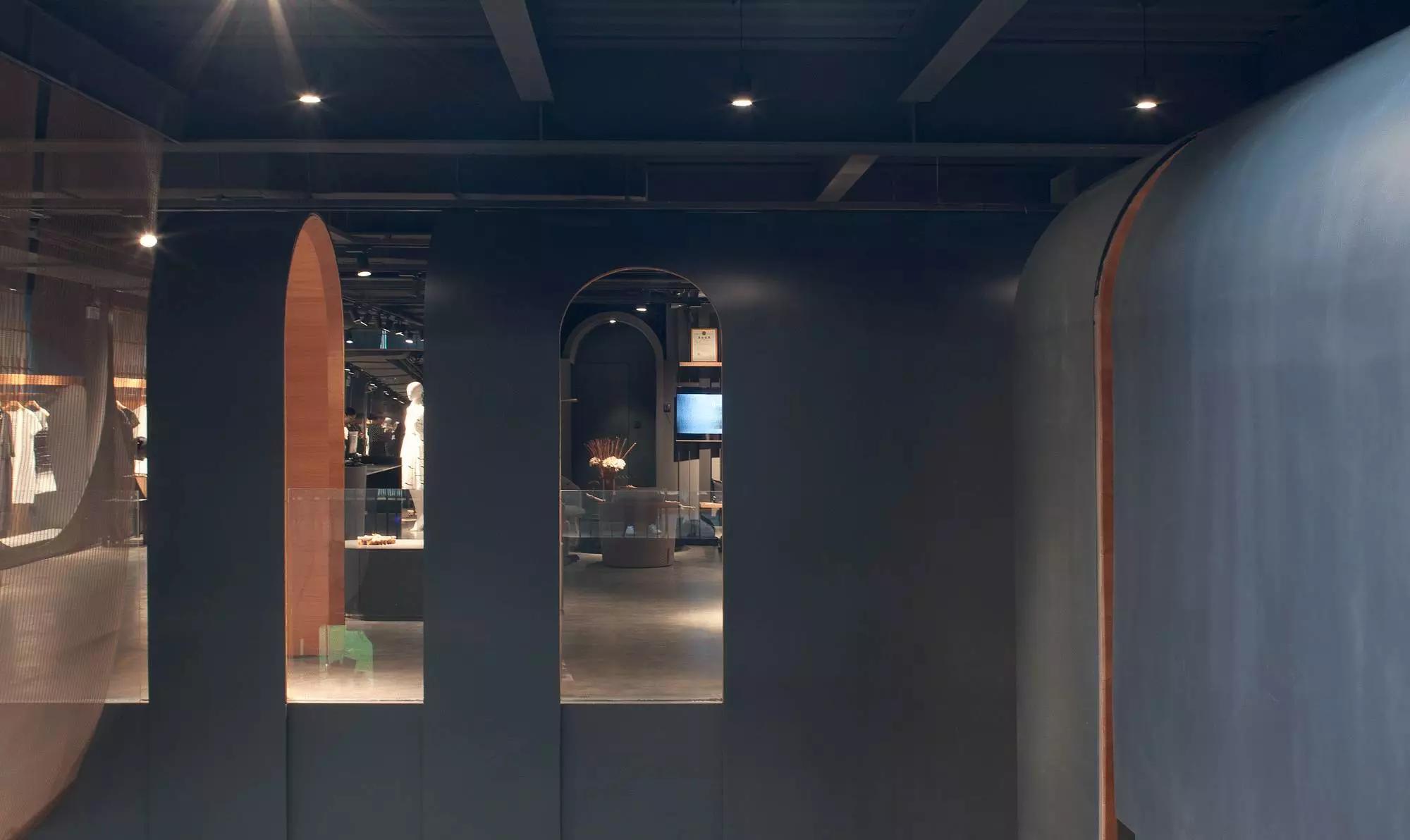內(nèi)部空間希望呈現(xiàn)一種原始野性的魅力,采用鋼制的表皮帶來一種現(xiàn)實感。這種“直白”式的架構(gòu)材料,空間所形成的直接性與樸素性,加上大尺度的鋼板落地產(chǎn)生的力量感或輕盈感,使整個空間與原有場地建筑取得一種時間與空間的接續(xù)關(guān)系。利用“拱”多變的空間特性,產(chǎn)生不同的空間,打破了均質(zhì)的體驗。這是一個回憶的過程,再一次將建筑的體量與空間對話,越是簡單的形體邏輯,越能給人帶來深刻的印象,弧拱曲線柔和,呈現(xiàn)不同角度的美感。弧拱的連續(xù)曲線把空間構(gòu)造成圍合區(qū)域,在這樣的方式下,內(nèi)部和外部保持著空間的連續(xù)性,這個理念使空間不拘泥于常規(guī),探索傳統(tǒng)類型空間的新秩序,"拱"在傳統(tǒng)建筑中扮演重要角色,并且在漫長的歷史中不斷豐富。我們試圖轉(zhuǎn)化傳統(tǒng)"拱",讓"拱"在均質(zhì)呆板的現(xiàn)代空間上制造新的突破,獲得自然能量并把它轉(zhuǎn)化為空間秩序。濃烈的空間美感,顯示該品牌的重要意義?;」巴臻g一、二層相連,創(chuàng)建出有趣的空間狀態(tài),吸引顧客的好奇心。
