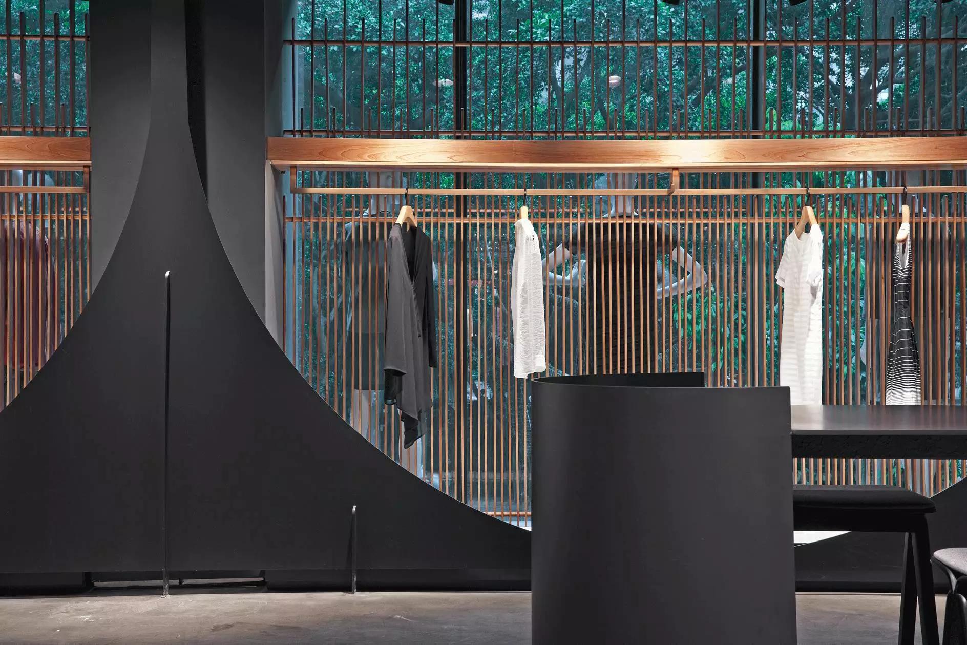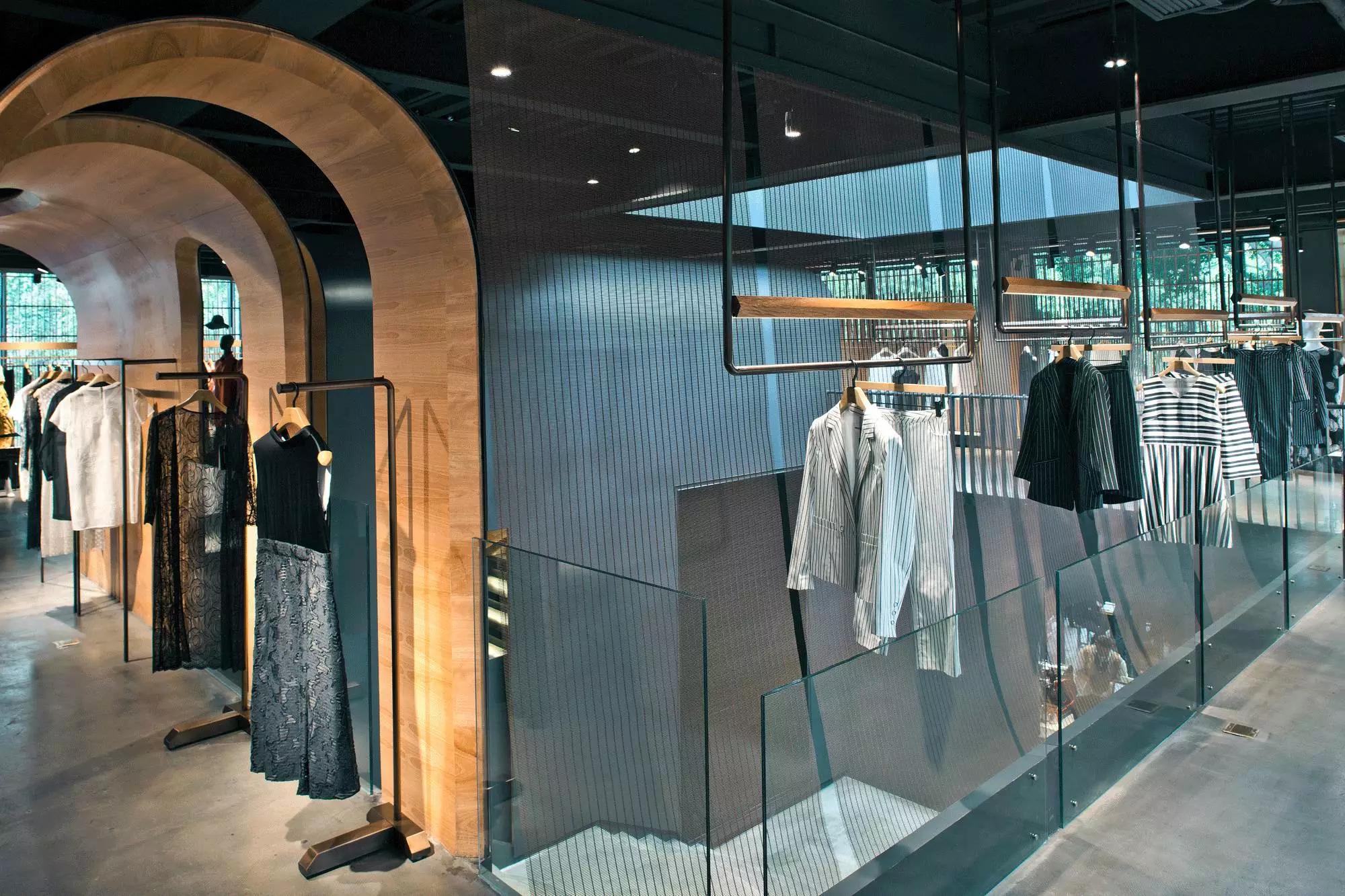 和一般常規(guī)服裝店陳列的概念不同,新的店鋪概念強調(diào)建筑化的零售模式。纖細的木屏風(fēng)結(jié)合貨架矗立在邊界處,渲染了空間和室內(nèi)飾面的豐富多樣性,建筑元素顯露材質(zhì)原始的質(zhì)感,烘托服裝的品質(zhì),這種手法為整個店鋪灌注純粹的氣氛,隱喻品牌的精神。天井樓梯釋放出不同光影效果,使整個空間與建筑取得一種時間與空間的對話。設(shè)計中,我們直白的將不同的“拱”垂直交疊,希望在垂直空間上制造不同的空間與體驗。這個特殊的表現(xiàn)方式給人們提供強烈的視覺效果。依據(jù)商業(yè)需求,采用模塊式設(shè)計,這樣可以使品牌不同功能具有最大的靈活性。
